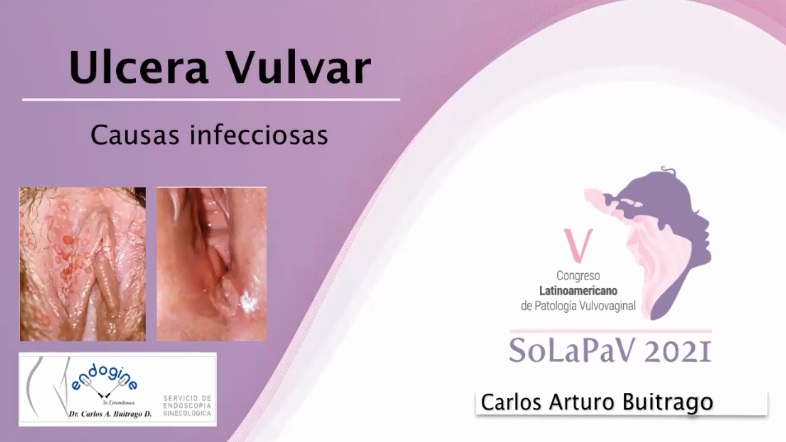 La ponencia presenta sobre la patología de Úlcera Vulvar las causas infecciosas, haciendo la diferencia también con erosión y fisura. Dentro de la clasificación de úlceras vaginales existen 4 grupos: infecciosas (ETS o no asociadas a ETS), Dermatológicas (Bullosa y no Bullosa), Tumoral y Traumática. Se presentan algunos ejemplos de úlceras vulvares asociadas a diferentes pacientes.